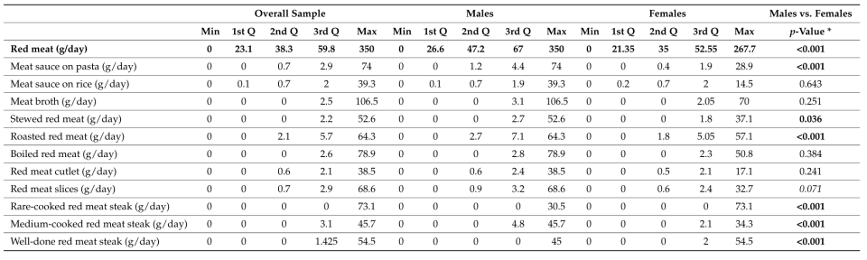 研究数据显示,男性整体红肉摄入量显著高于女性(51.39克/天 vs. 39.99克/天)。男女在红肉种类偏好上也存在显著差异:男性更倾向于食用意面肉酱、炖红肉、烤红肉、中等熟度牛排、动物脂肪、马肉、肝脏和内脏;而女性则更喜欢全熟牛排、红肉丸和羊肉。