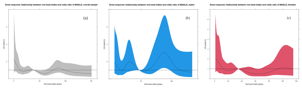 在男性中,红肉摄入量在75至90克/天范围内显示出对MASLD的不利影响。这一剂量反应关系仅在男性中观察到,且局限于特定摄入水平。整体人群中,红肉消费并未表现出与MASLD的一致剂量反应趋势,这与此前一些研究的结论有所不同,提示红肉与肝脏健康的关系可能比想象中更复杂。