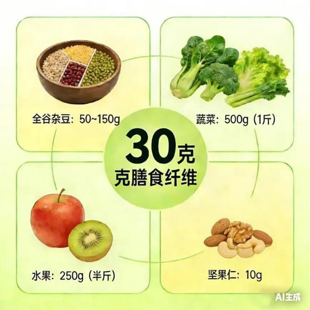 一个懒人公式,帮你算清楚:每天吃够30克膳食纤维≈一小碗全谷杂豆+1斤蔬菜+1个拳头大小的水果+一小把坚果仁。