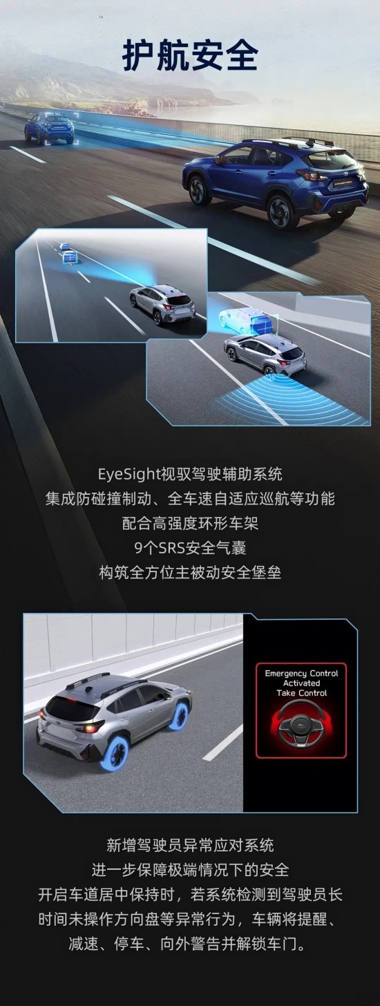 配置内饰方面,新车依旧配有大量的物理按键,中控台区域配备三辐式方向盘、4.2英寸彩色屏+机械指针仪表盘以及11.6英寸中控屏,既保留了传统机械仪表的实用性,又融入了现代科技元素。配置上,新车配有标配增强版EyeSight视驭驾驶辅助系统,提供预防碰撞、全车速自适应巡航、车道居中保持、辅助跟车、预防误操作、车道偏离修正以及警报提示等多项功能。