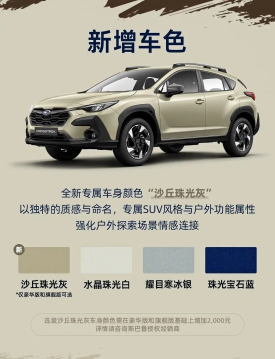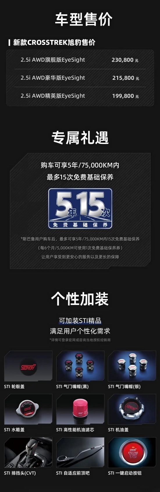 日前,斯巴鲁新款CROSSTREK旭豹正式上市,新车共推出3款车型,售价区间为19.98-23.08万元。同时,购车可享5年/75000km内最多15次免费基础保养,并提供STI精品加装,包括轮圈中心盖、气门嘴、水箱盖、排挡头以及前顶吧等。