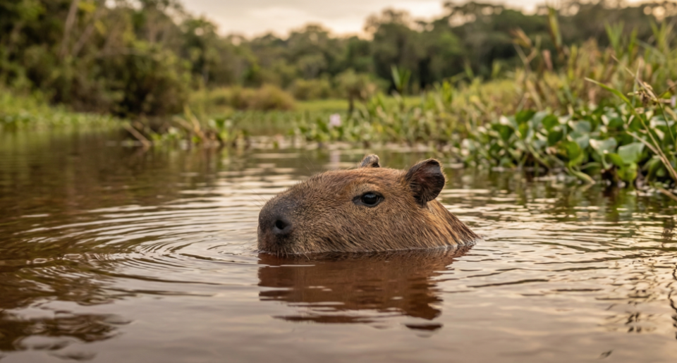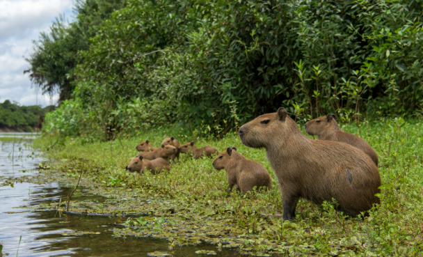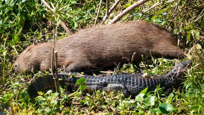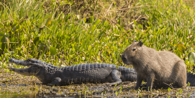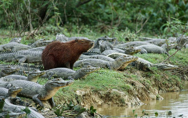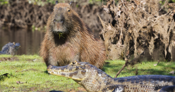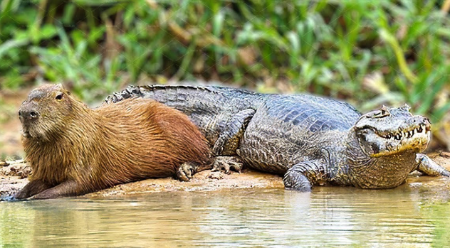 在南美洲的河流系统和沼泽地带,尤其是在巴西西部广袤的潘塔纳尔湿地,水豚与凯门鳄是直接共享栖息地的。